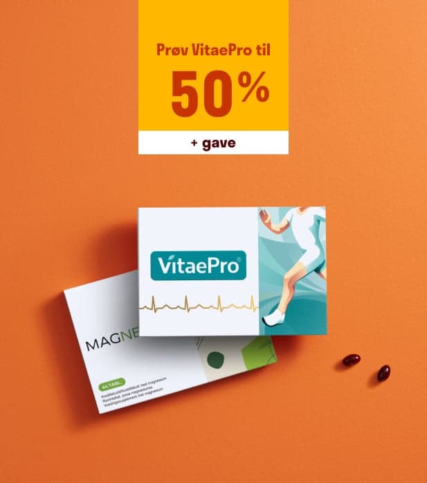 Bestiller du VitaePro i dag, får du første pakke til kun 179 kr. Du sparer 50%, plus du får Magnesium i gave.