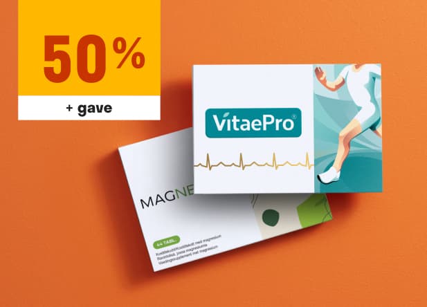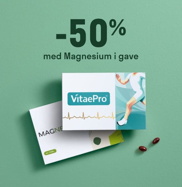 Bestiller du VitaePro i dag, får du første pakke til kun 179 kr. Du sparer 50%, plus du får Magnesium i gave.